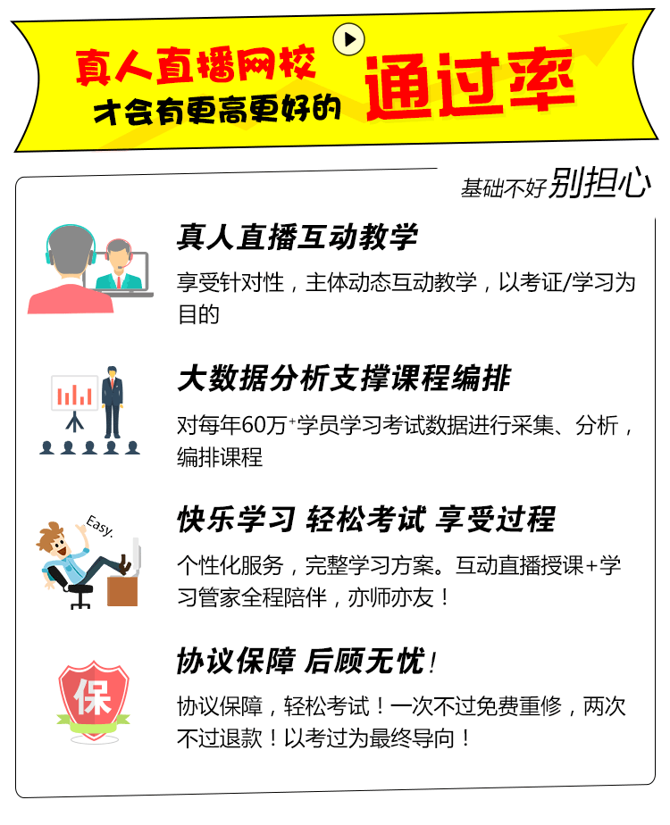 - 4、享受一年VIP学习权限,考试不过免费重修。